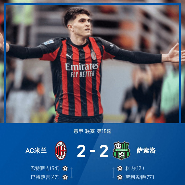 12月14日 25/26赛季意甲联赛第15轮,AC米兰主场以2-2战平萨索洛。科内为萨索洛首开纪录,随后巴特萨吉双响,助米兰反超比分,劳利恩特助萨索洛追平比分。米兰的普利西奇和拉比奥两个进球,则被判罚无效,最终AC米兰2-2战平萨索洛,1分优势领跑!